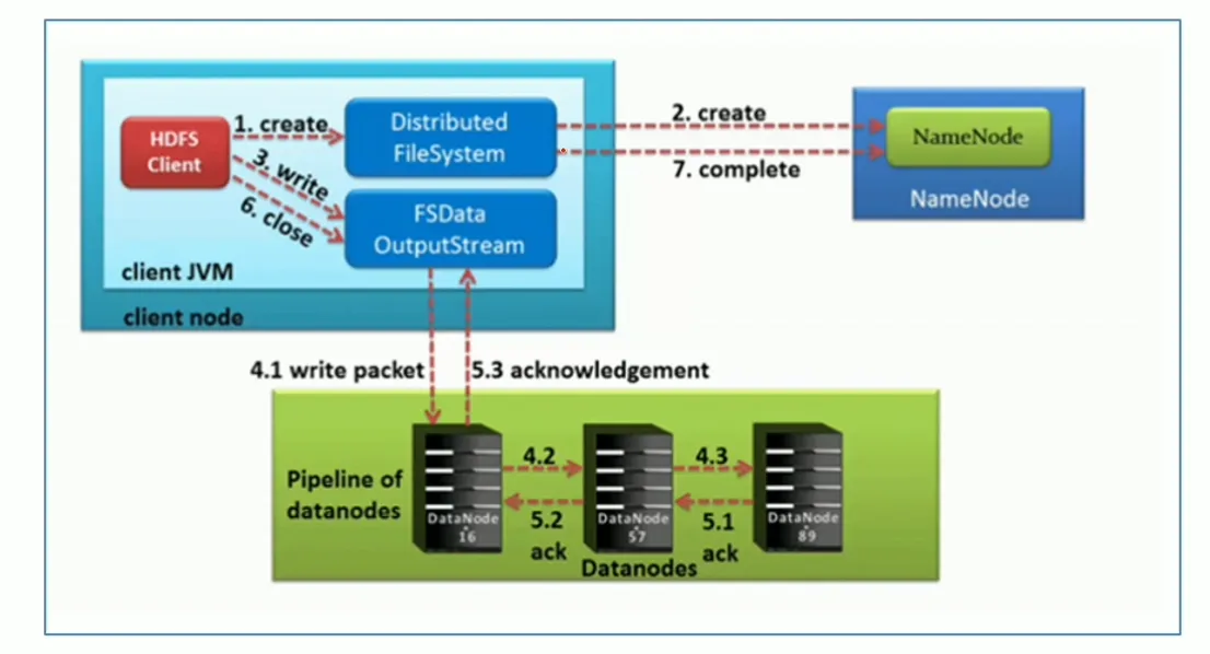 step4:客户端写入数据时,将数据分为一个个数据包(packet 默认64k),内部组件datastreamer请求NameNode挑选出适合存储数据的一组datanode地址,默认是3副本存储