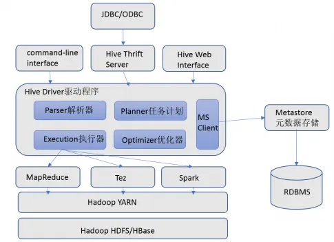 外部客户端通过网络与Hive进行交互,类似于JDBC或ODBC协议。WebGUI是通过浏览器访问Hive。