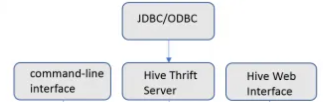 包括CLI、JDBC/ODBC、WebGUI。其中,CLI(command line interface)为shell命令行;Hive中的Thrift服务器允许