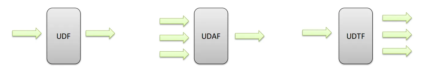 用户定义函数根据输入输出的行数可分为3类:UDF、UDAF、UDTF。