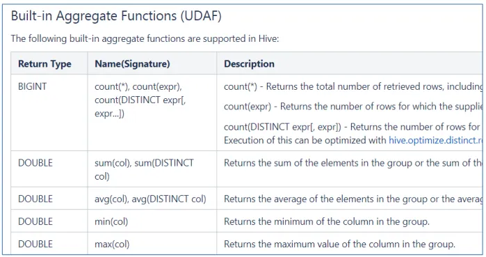 比如Hive官方文档中,针对聚合函数的标准就是内置的UDAF类型