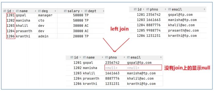 通俗解释:join时以坐标的全部数据为准,右表与之关联;左表数据全部返回,右表关联上的显示返回,关联不上的显示null返回。
