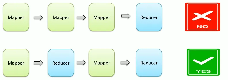 不能有诸如多个map阶段、多个reduce阶段的情景出现;