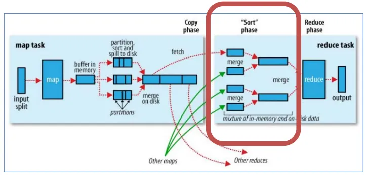 Sort阶段:再对数据进行合并的同时,会进行排序操作,由于MapTask阶段已经对数据进行了局部的排序,ReduceTask只需保证Copy的数据的最终整体有效即可